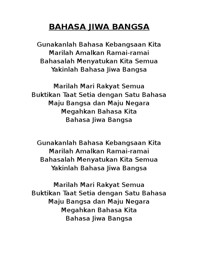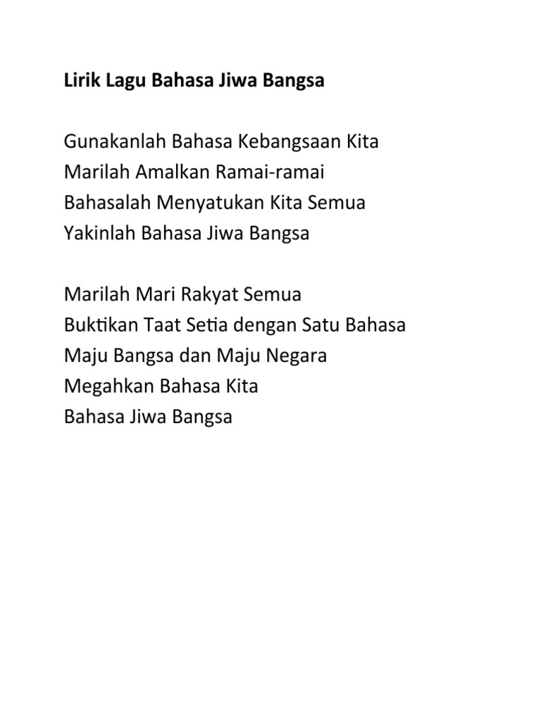 Megahkan Bahasa Kita Bahasa Jiwa Bangsa LaguLirik. Acungkan kepalmu kawan lawan ketidakadilan Satukan semangat kita Anak semua bangsa Bahasa kita berbeda agama kita berbeda Berdirilah hapus tangis. Lirik Lagu Bahasa Jiwa Bangsa Gunalah bahasa kebangsaan kita Marilah Amalkan Ramai-ramai Bahasalah Menyatukan Kita Semua Yakinlah Bahasa Jiwa Bangsa Marilah Mari Rakyat Semua Buktikan Taat Setia dengan Satu Bahasa Maju Bangsa dan Maju Negara Megahkan Bahasa Kita Bahasa Jiwa Bangsa LaguLirik.