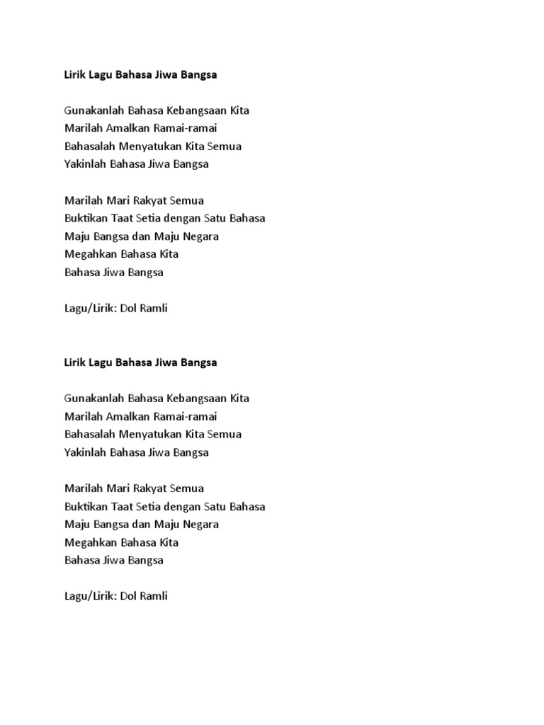 Lirik Lagu Bahasa Jiwa Bangsa. Lirik lagu Bahasa Jiwa Bangsa ciptaan Tan Sri Dol Ramli ini memberikan pengertian yang cukup besar mendalam dan seharusnya dijadikan renungan untuk semua rakyat Malaysia. Yakinlah bahasa jiwa bangsa.
